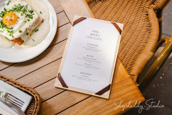🔹 Eine massive Holzkarte mit eingeprägtem Logo oder Lederdetails vermittelt Eleganz und Exklusivität – perfekt für Fine-Dining-Konzepte.
